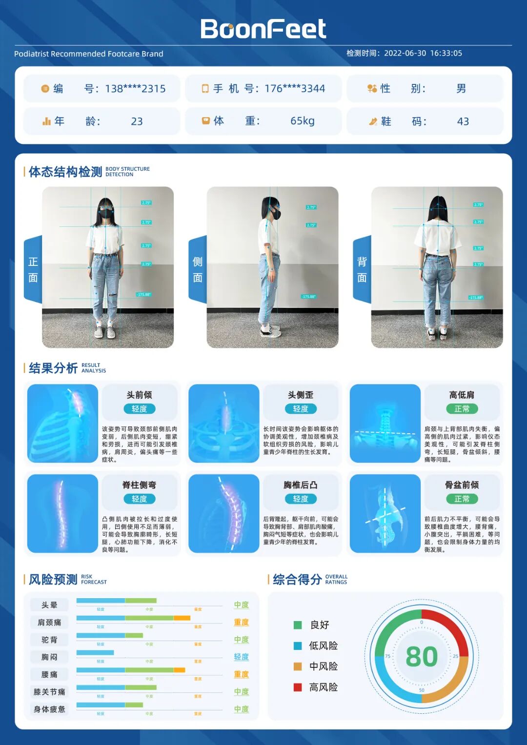 BoonFeet-S1身体姿态分析结果报告包括:头部冠状面位置、头部矢状面位置、高低肩、驼背、骨盆前倾、脊柱风险、健康风险提示、综合评分等。
