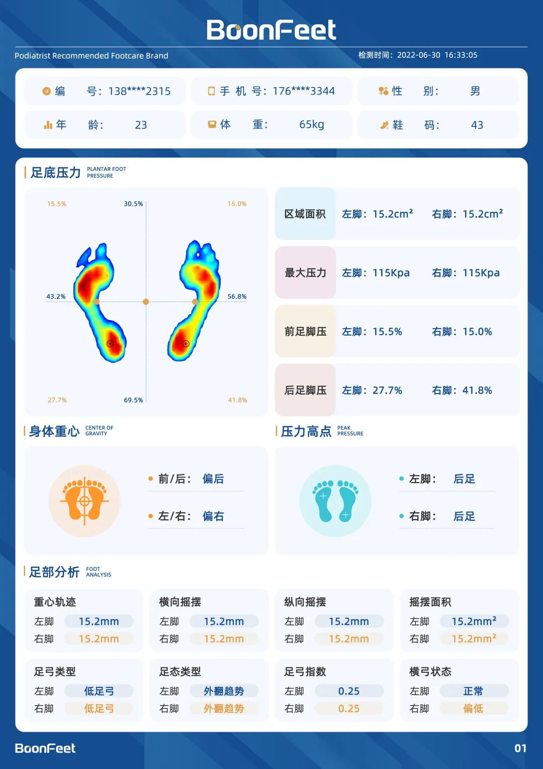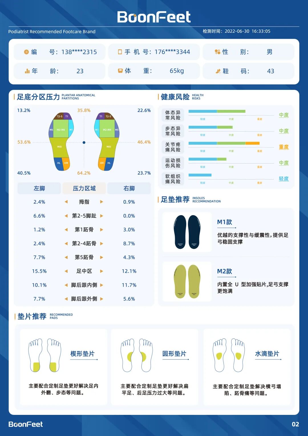 BoonFeet-S1足底压力分析报告结果包括:足弓类型(正常足弓、高足弓、低足弓、扁平足)、足态类型(正常足、足内翻、足外翻、严重足外翻)、足底压力分布图、前脚掌脚压、后脚掌脚压、压力最高点、左右脚重心、健康风险提示、足垫推荐、垫片推荐等。
