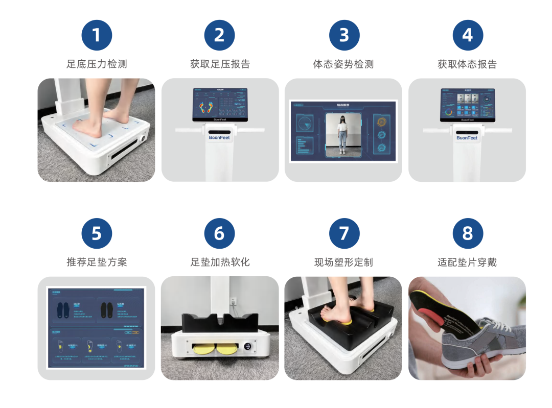 通过BoonFeet足垫定制系统可以了解身体力学健康状况和风险情况,为医疗、康复、体育、美容、鞋业及零售等行业赋能,有助于制定更加专业、完善的解决方案。穿着定制足垫,可以改善足底压力异常分布,纠正下肢生物力线,有效预防运动损伤,缓解足部疼痛,巩固康复效果,提升运动表现。与此同时,系统采用独特的加热定型技术,使得每一双足垫均为“量脚定制”,定制流程标准且高效,现场8分钟即可获得一双贴合足弓形态且舒适的功能性定制足垫。对于改善体态和步态、预防其他足脊问题、辅助足疾治疗等也有很好的效果。