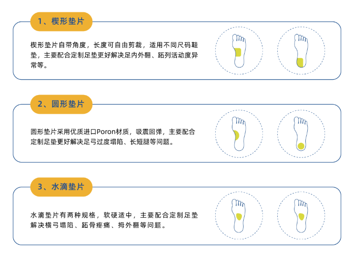 不同规格垫片辅助足垫更好解决足部问题,如足外翻、跖骨痛、长短腿等。