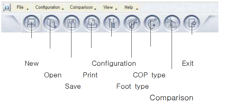 Gaitview 图标 主畵面上端左侧开始以New / Open / Save / Print / Configuration/ Foot type / COP type / Comparison / Exit 顺序来排列。